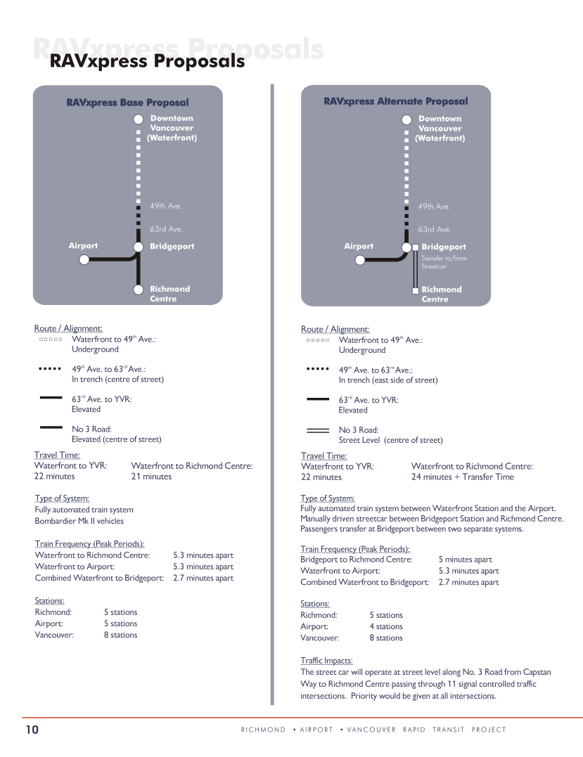 (A fifth proposal from SNC-Lavalin deferred the Richmond segment of the line, instead opting to maintain the existing 98 B-Line bus service using No. 3 Road’s dedicated bus lanes into downtown Richmond.)