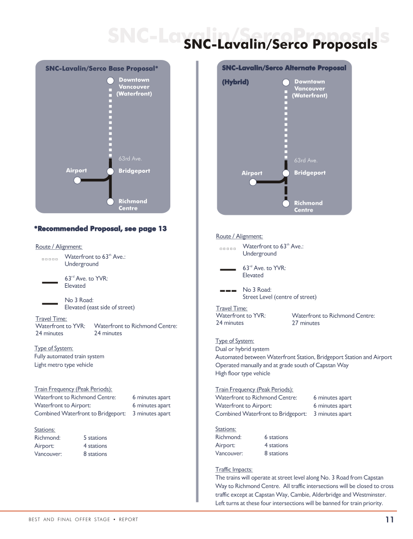 Evaluators tested operational simulations, cost models, and construction sequencing. After RAVRail and RAVLink Transportation did not provide proposals that met the specifications, RAVxpress and SNC-Lavalin/Serco were brought forward as the final two proponents invited to the “BAFO” (Best and Final Offer) stage. Each proponent team submitted two final base proposals: