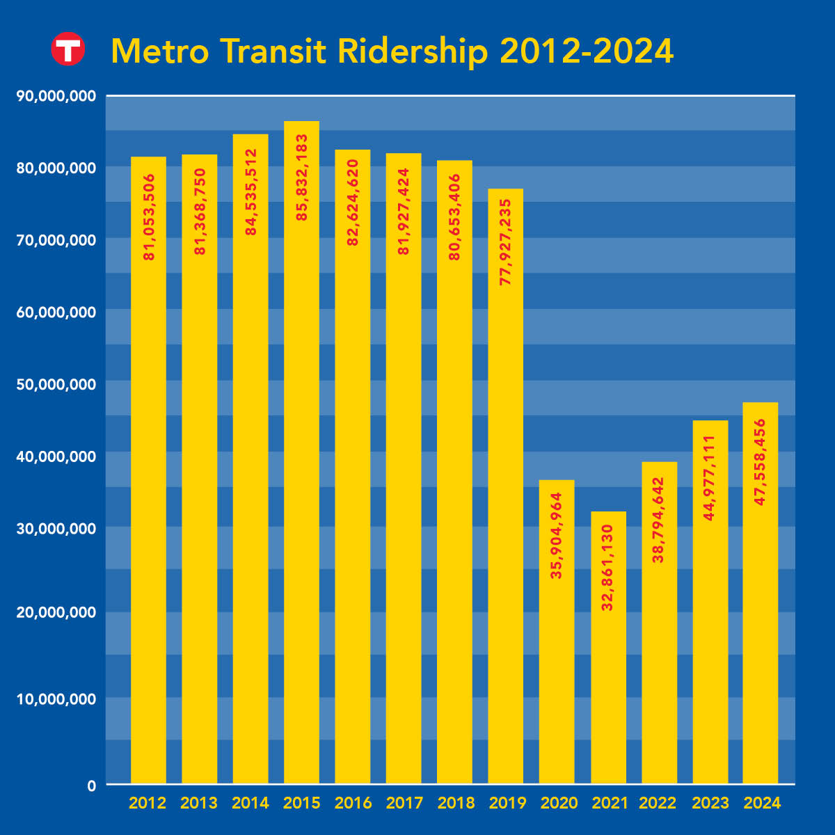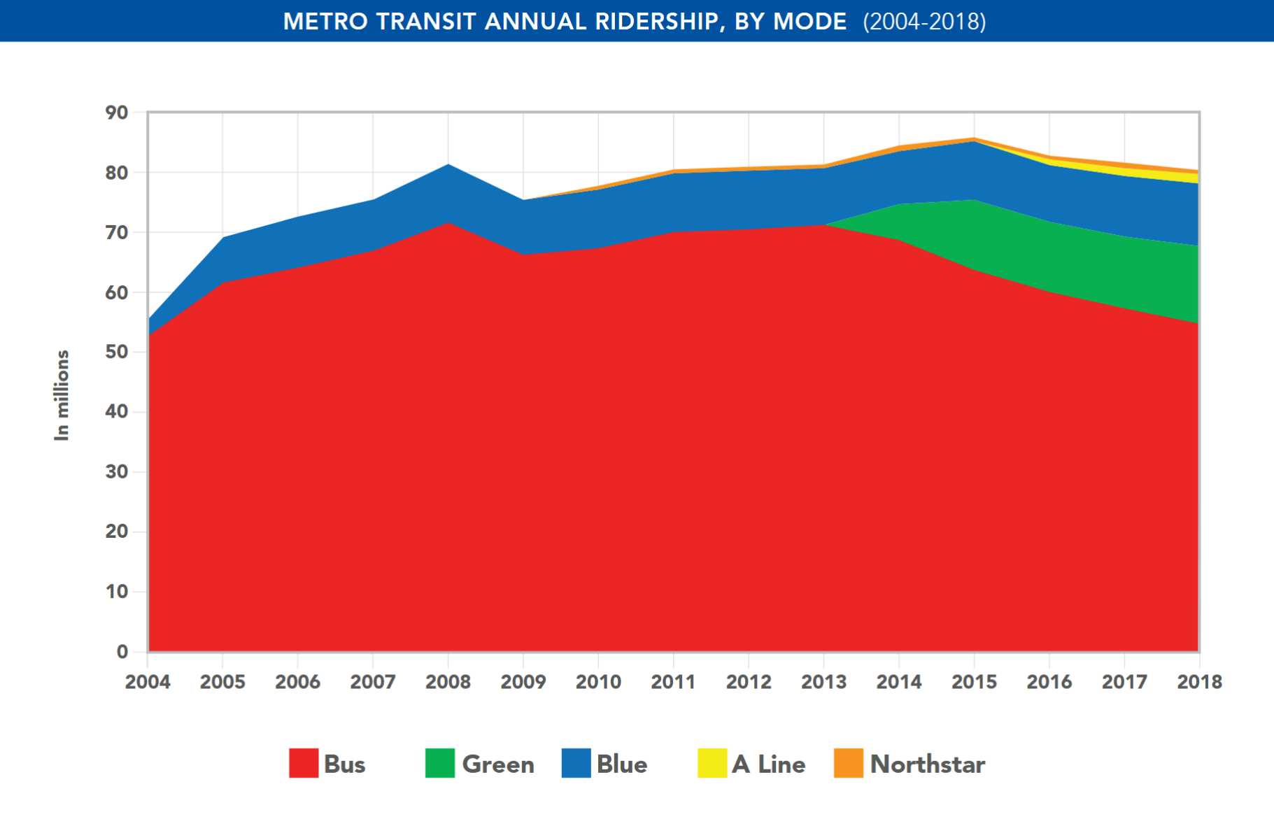 Although the Green Line was widely viewed as a ridership “success”, Metro Transit’s overall system saw ridership fall in the years that followed. Bus usage began declining almost immediately after the line opened—partly because bus riders shifted to the Green Line (including due to the service cuts on Routes #94 and #16), and partly because the arrival of rideshare apps like Uber and Lyft in 2014 had introduced new competition for short‑ and medium‑distance trips.