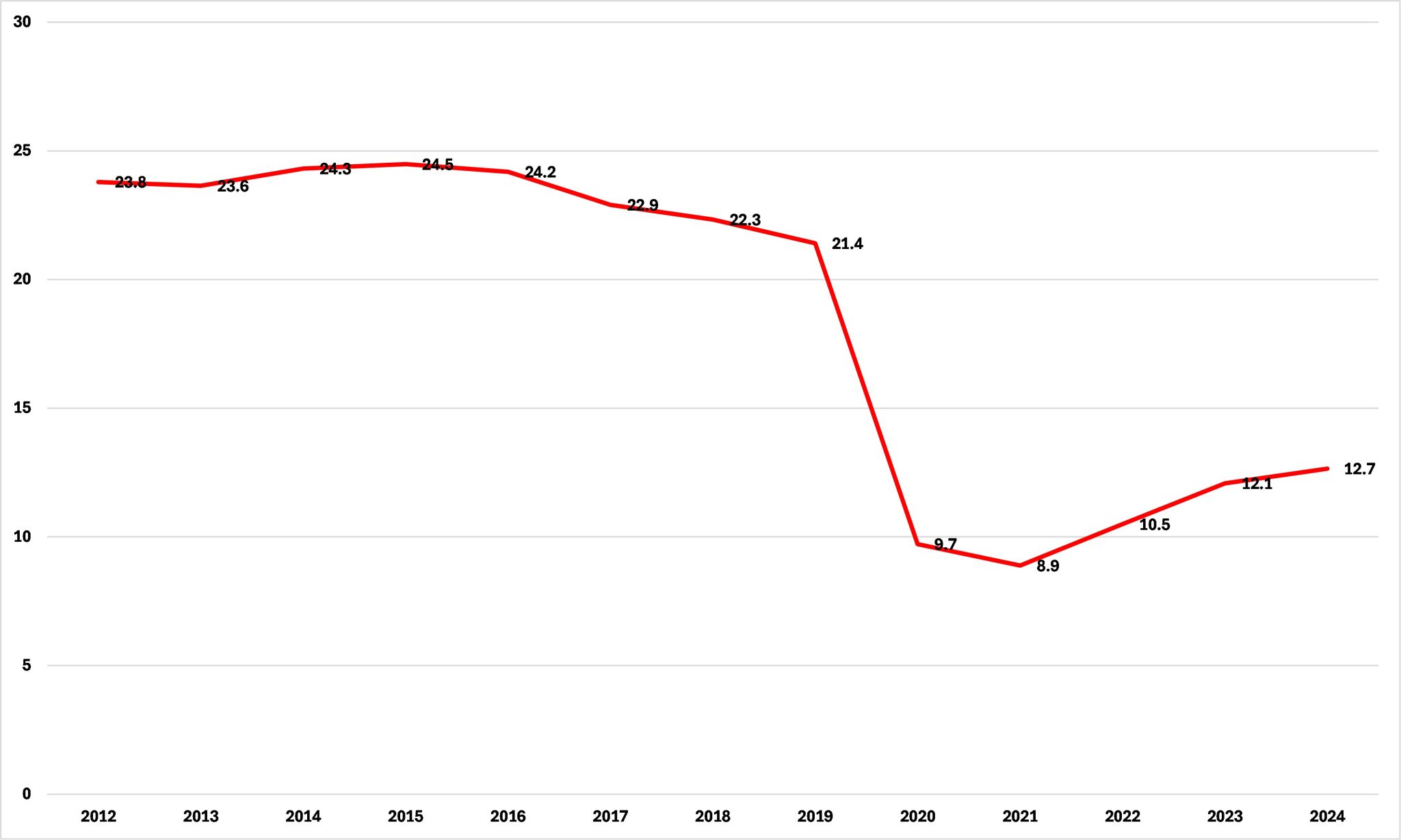 Metro Transit’s own charts illustrate the trend clearly[19][20][21]. Systemwide ridership peaked in 2015, then steadily declined, returning by 2019 to pre-Green Line levels. A second chart shows the dynamic more sharply: during the Green Line’s first two years, its rapid ridership growth coincided with a steep drop in bus ridership. After that initial shift, Green Line growth flattened while bus ridership continued to erode.