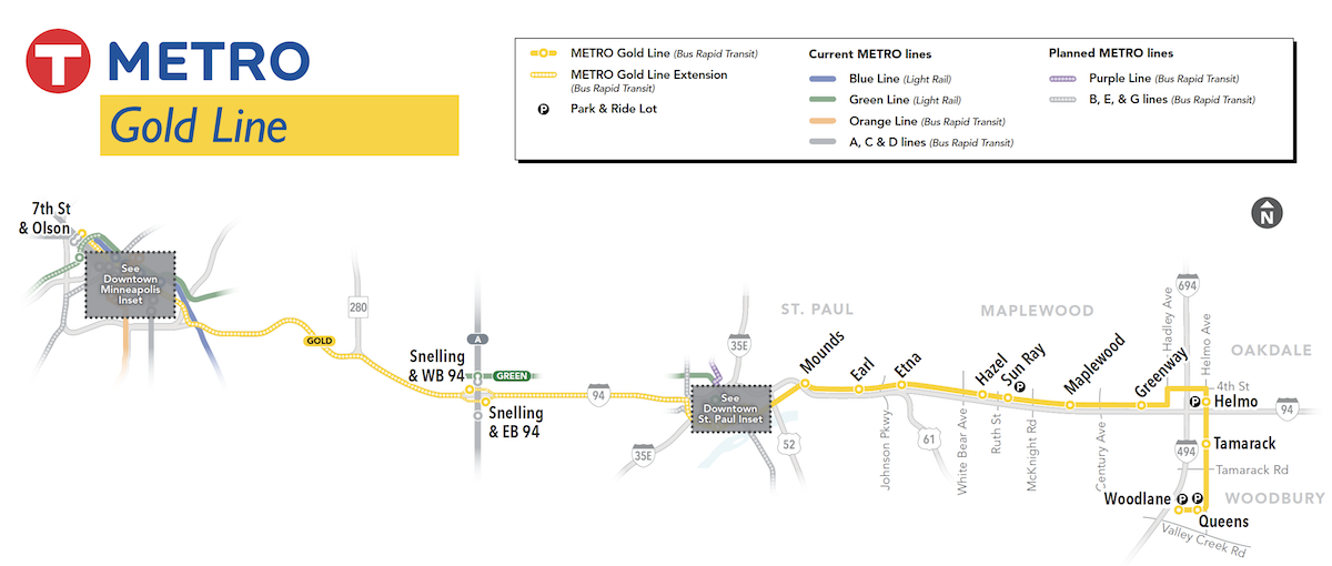 In October 2024, Metro Transit announced the westward extension of the Gold Line to downtown Minneapolis along the I-94 freeway, providing a fast, frequent, and all-day rapid transit connection between the two downtowns, superseding the Green Line LRT.